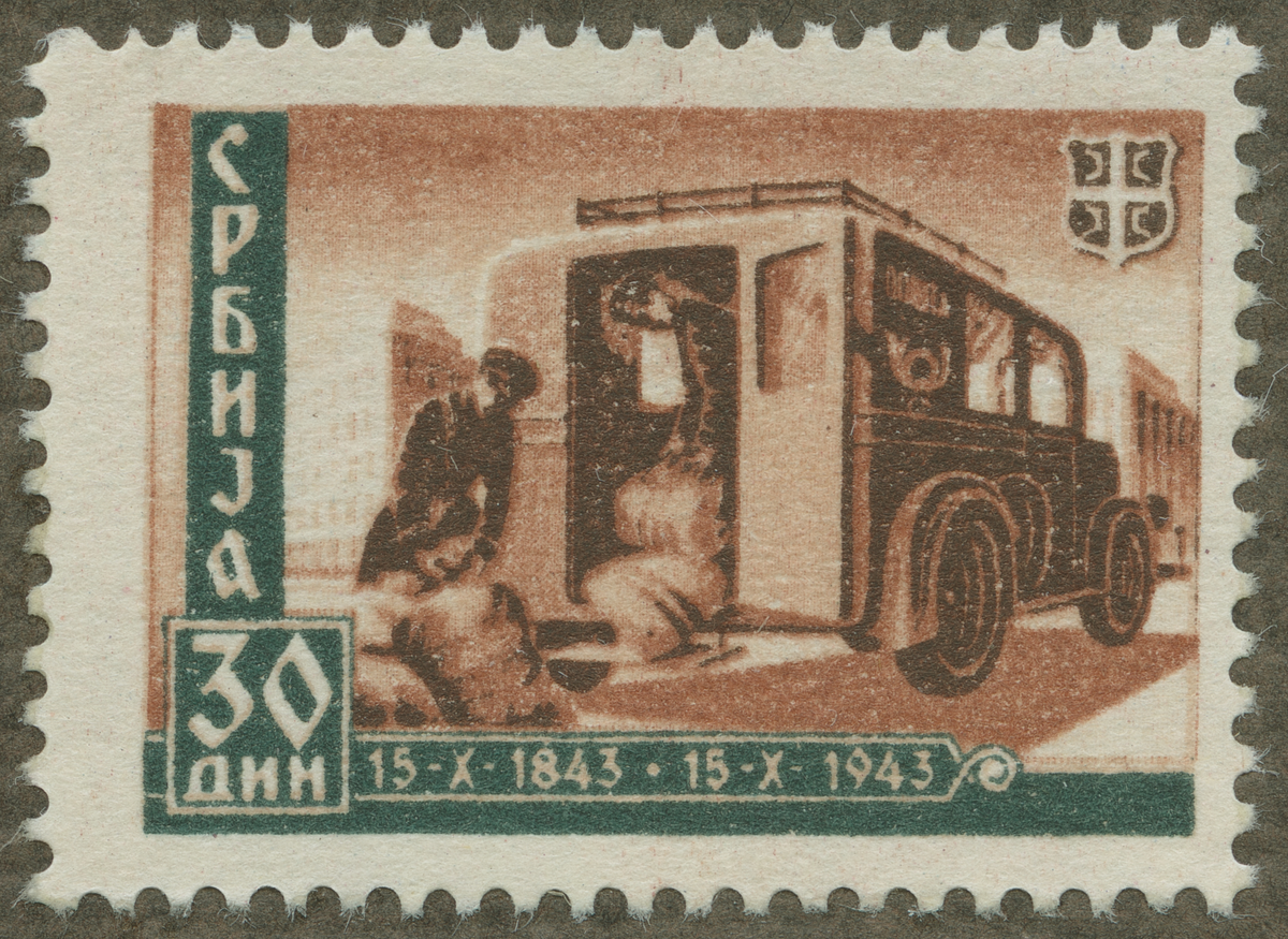 Frimärke från Serbien, 1943. Motiv av Postbuss i Serbien Serbiska posten 100 år 15.10.1843-15.10.1943