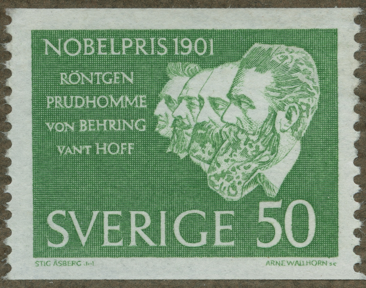 Frimärke från Sverige, 1961. (nr. 1 fr.v.): Motiv av Jacob Hendrik van 't Hoff: 1852-1911. Holländsk fysikalisk kemist. Grundlade stereokemien 1875 (tillsammans med fransmannen Le Bel). Utredde lagarna för en lösnings osmotiska tryck 1886 m.m. Professor vid Berlins Universitet 1894. Nobelpris i kemi 1901. -60-årsminnet av första Nobelprisutdelningen 1901-