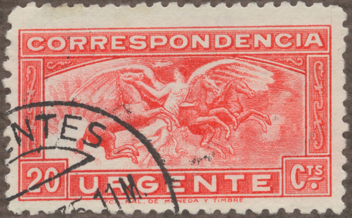 Frimärke från Spanien, 1934. Motiv av Symbol för hastig brevbefordran Till expressbrev: "urgente"