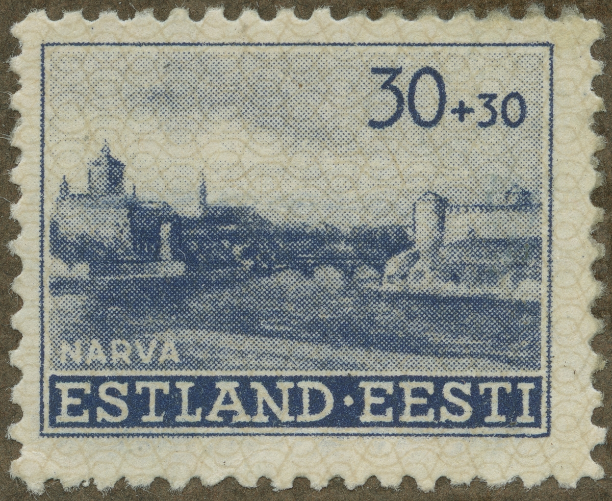 Frimärke från Estland, 1926. Motiv av Staden Narva (t.v. i bakgrunden: Narva fästning)