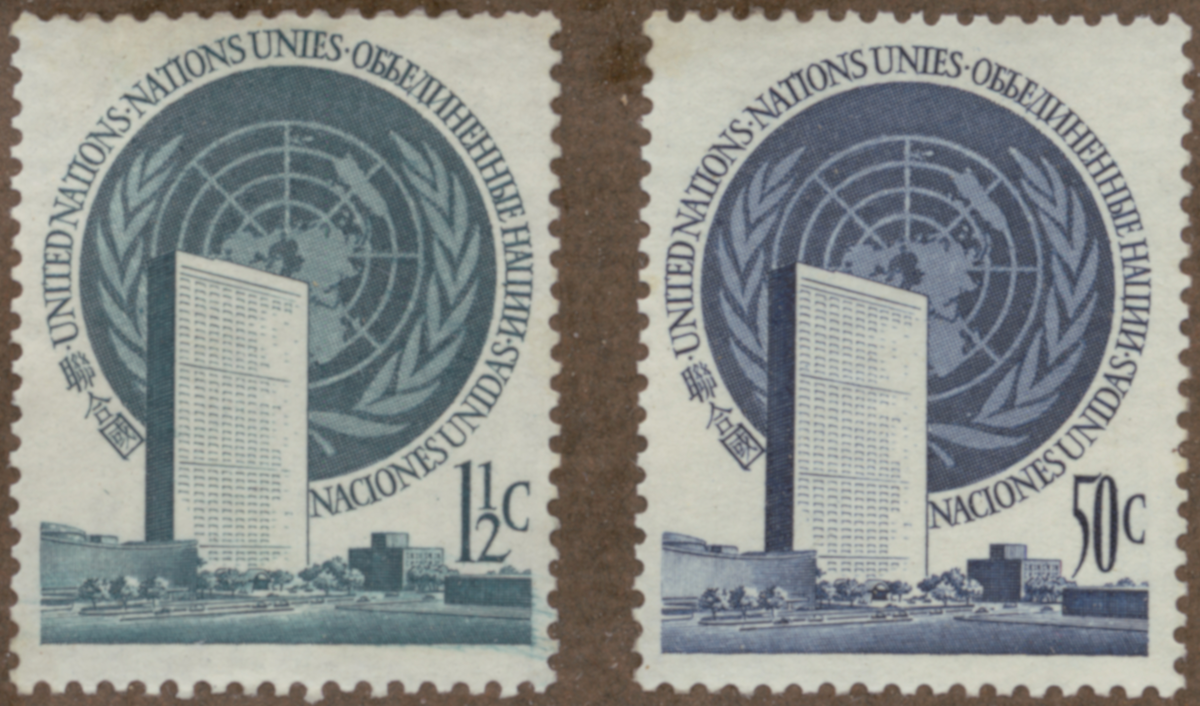 Frimärke från Förenade Nationer: Nations Unies, 1951. Motiv av F N byggnaden FN-märket