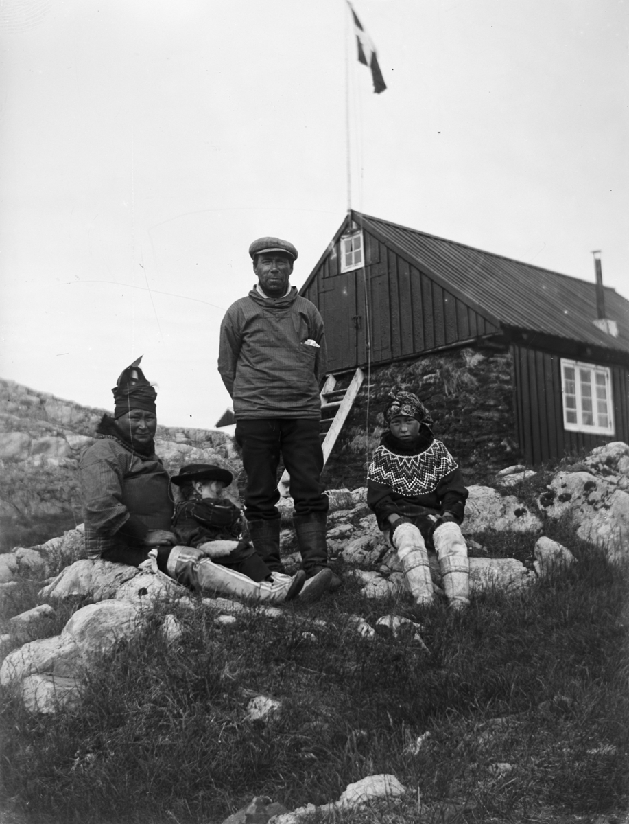 Fotografi från Grönland. Motiv av man, kvinna och barn framför hus.