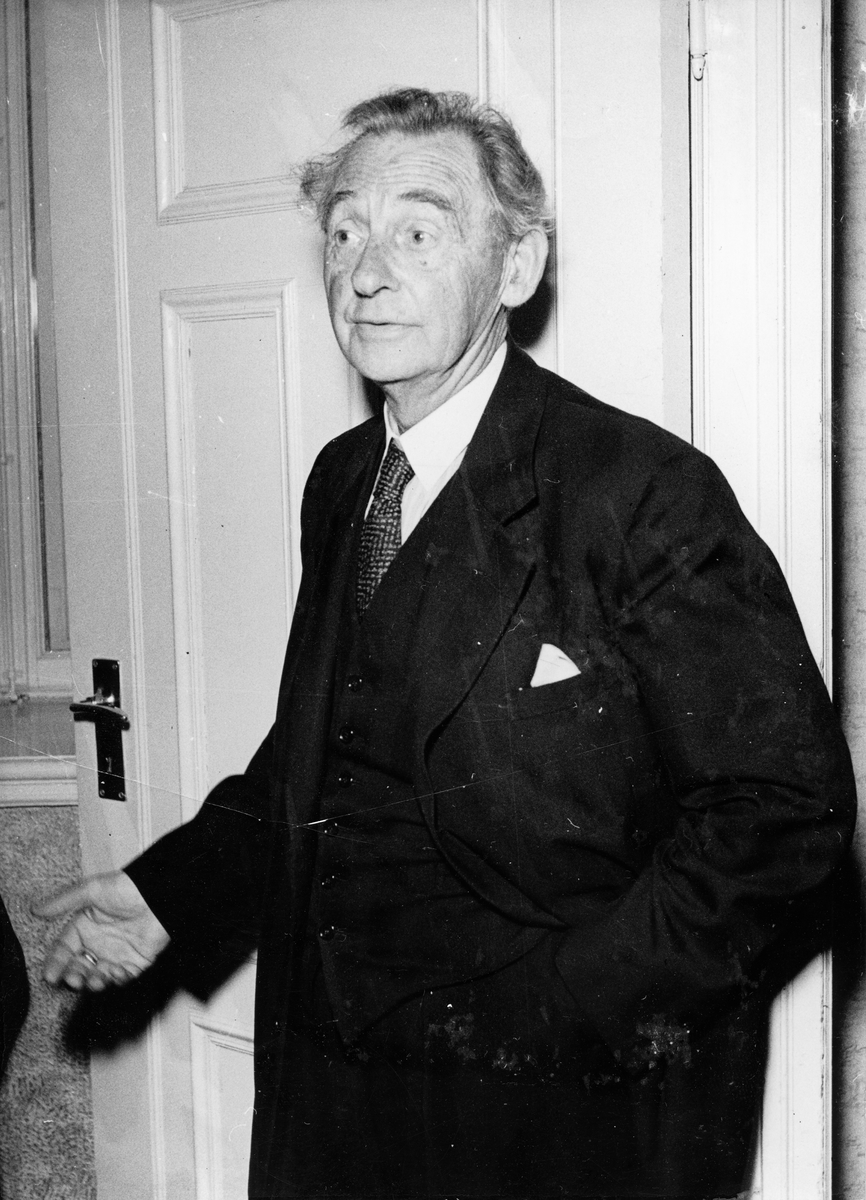 Hovkonstgjutare Herman Bergman håller kåserande föredrag om konstgjutning inför Svenska Uppfinnarföreningens sommarmöte med damer den 8 juni 1945 å restaurang Foresta, Herserud, Lidingö.
