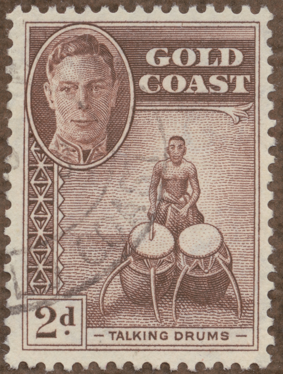 Frimärke från Guldkusten, 1948. Motiv av Man spelandes på Tam-tam-trummor. Överst till vänster Kung George VI. "Till signalspråk över större avstånd".