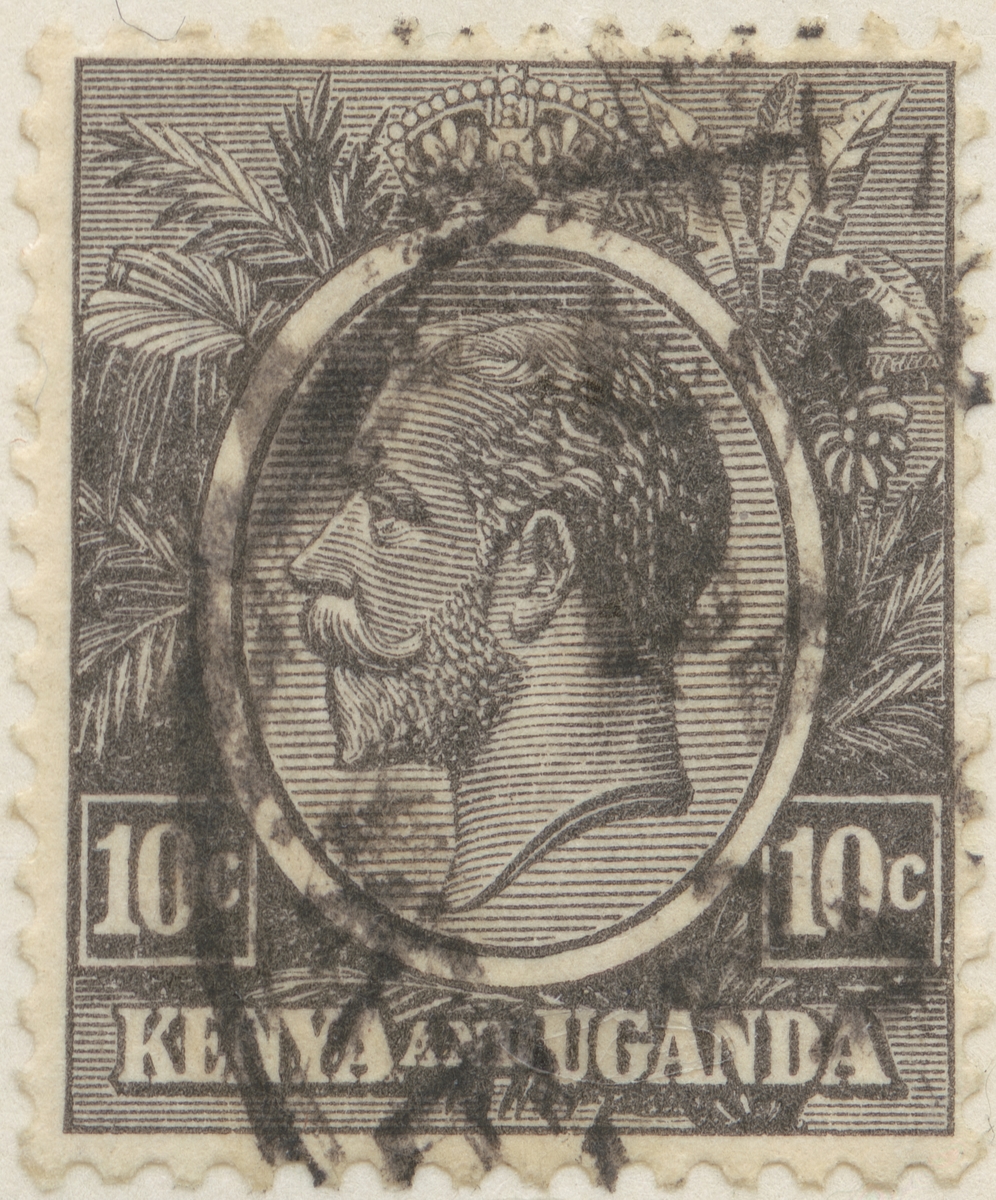 Frimärke från Kenya, 1922. Motiv av banan, dadel och Kung George V.