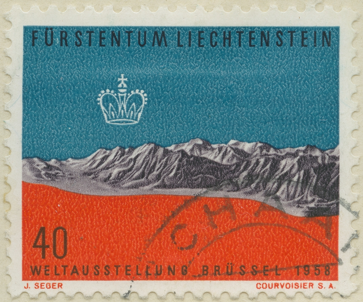 Frimärke ur Gösta Bodmans filatelistiska motivsamling, påbörjad 1950. Frimärke från Lichtenstein, 1958. Motiv av Berglandskap "Europa symbol för Bryssel Utställningen 1958"