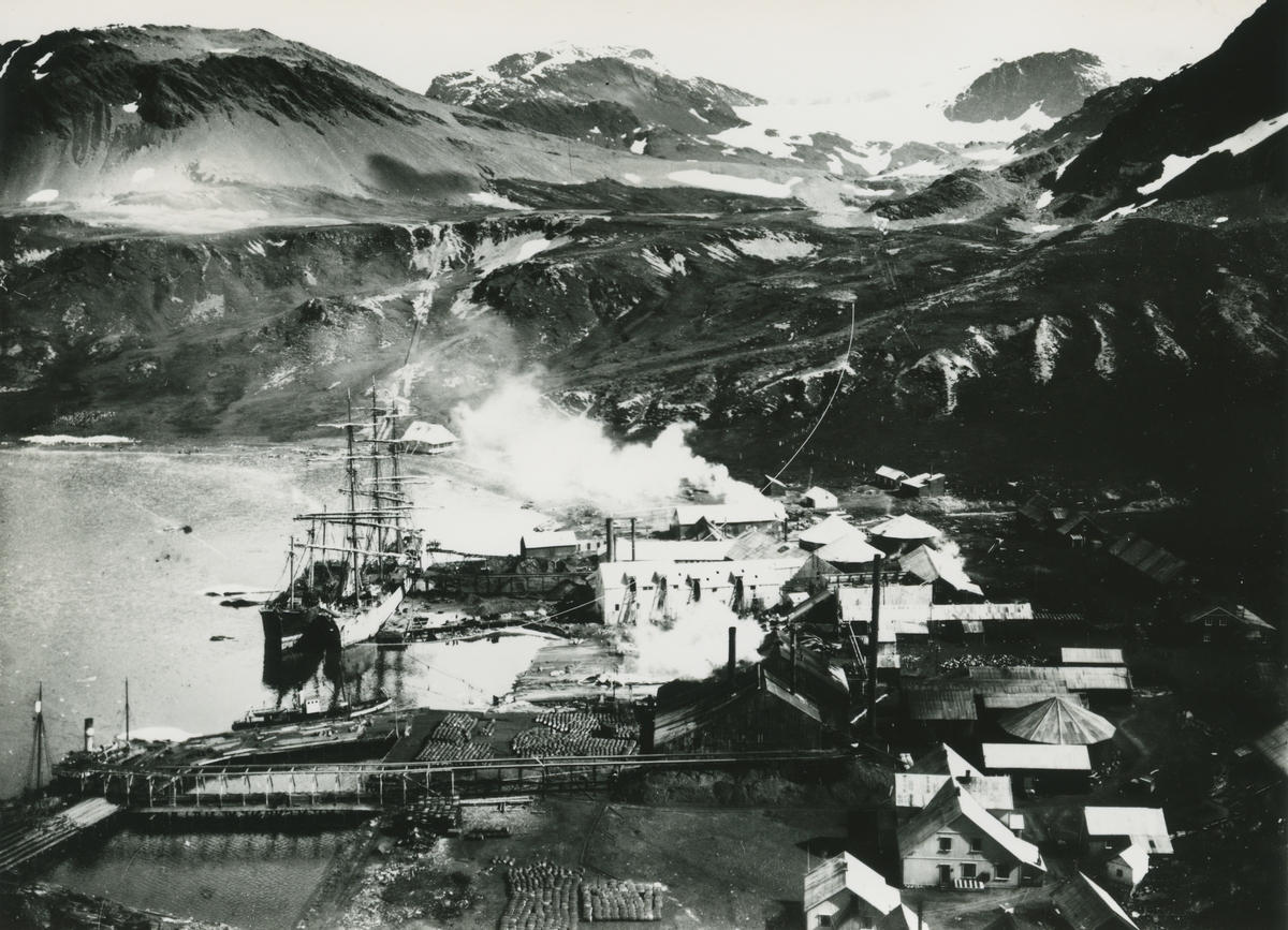 Bild från expedition i Antarktisområdet. Vy över hamn, och berg.