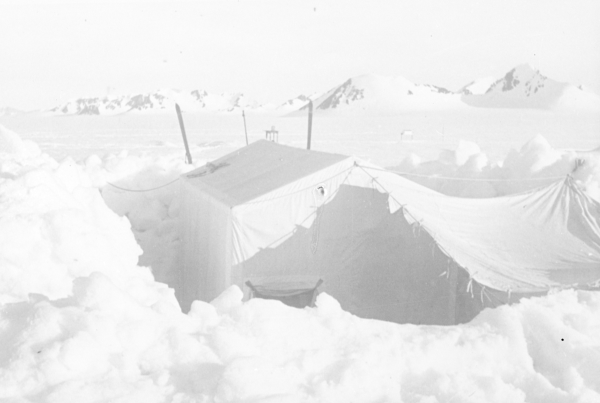 Fotografi från expedition till Spetsbergen. Motiv av tält i snötäckt bergslandskap.