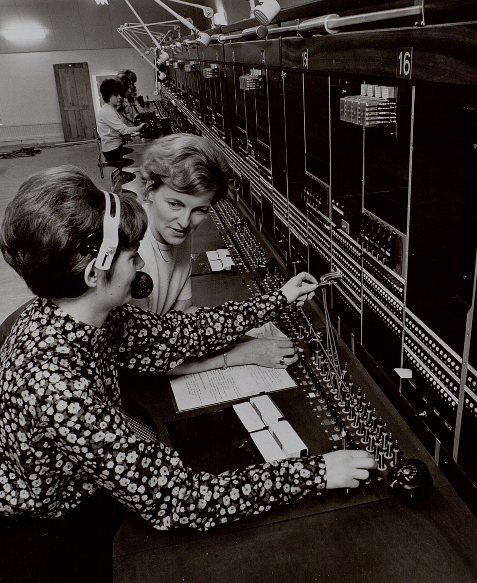 Den provisoriska halvautomatiska riksexpeditionen på Strömstads nya station (upphörde i och med klenkoaxialkabeln Trollhättan - Uddevalla -Strömstad) i november 1966. Telefonisten R. Leh tränas av elevlär. L. Baatz.