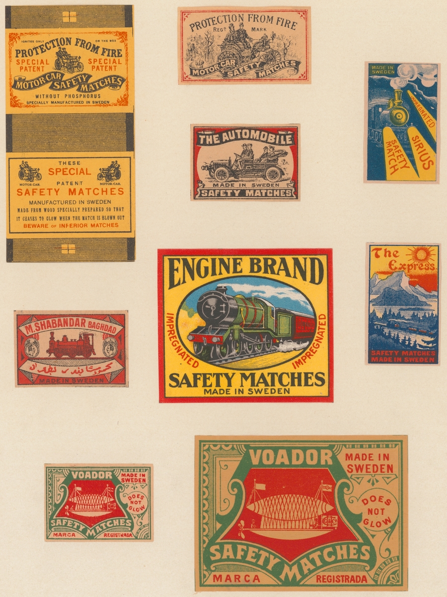 Etiketter för tändsticksaskar, från Svenskt Industri- och Handelsmuseum.