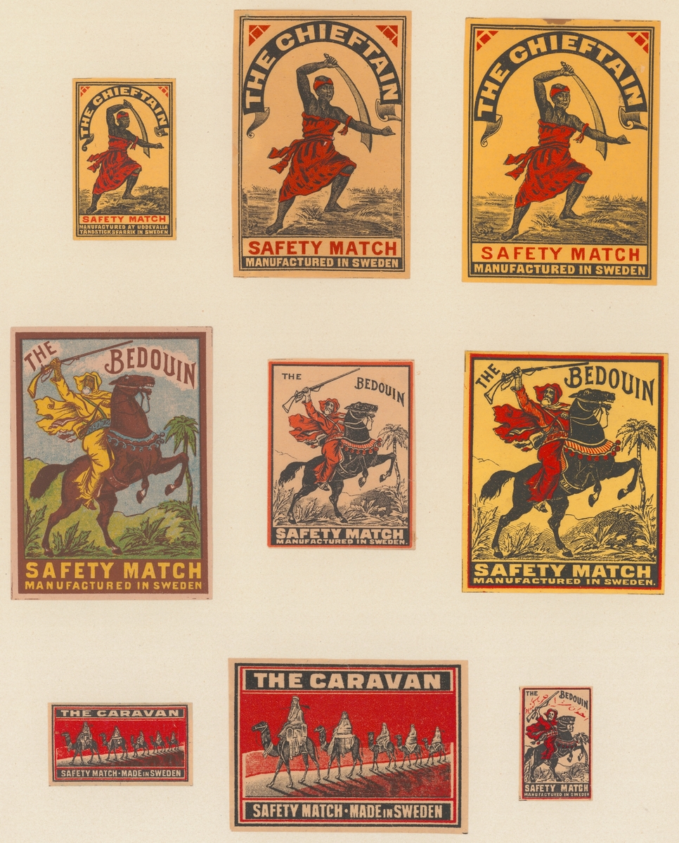 Etiketter för tändsticksaskar, från Svenskt Industri- och Handelsmuseum.