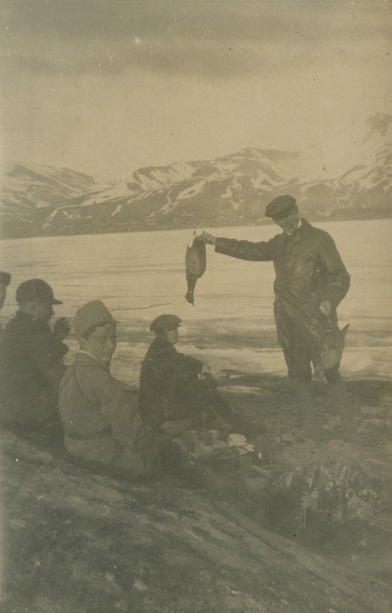 Fotografi från expedition till Spetsbergen. Motiv av män på strand vid vatten. En av männen visar upp två skjutna fåglar för de andra. I bakgrunden syns snötäckta berg.