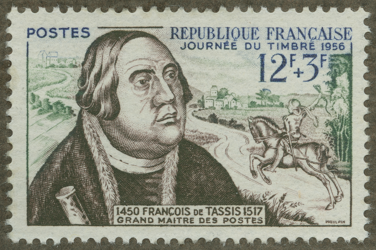 Frimärke från Frankrike, 1956. Motiv av François de Tassis 1450 - 1517 Grand Maitre des Postes Postryttare Frimärkets dag 1956