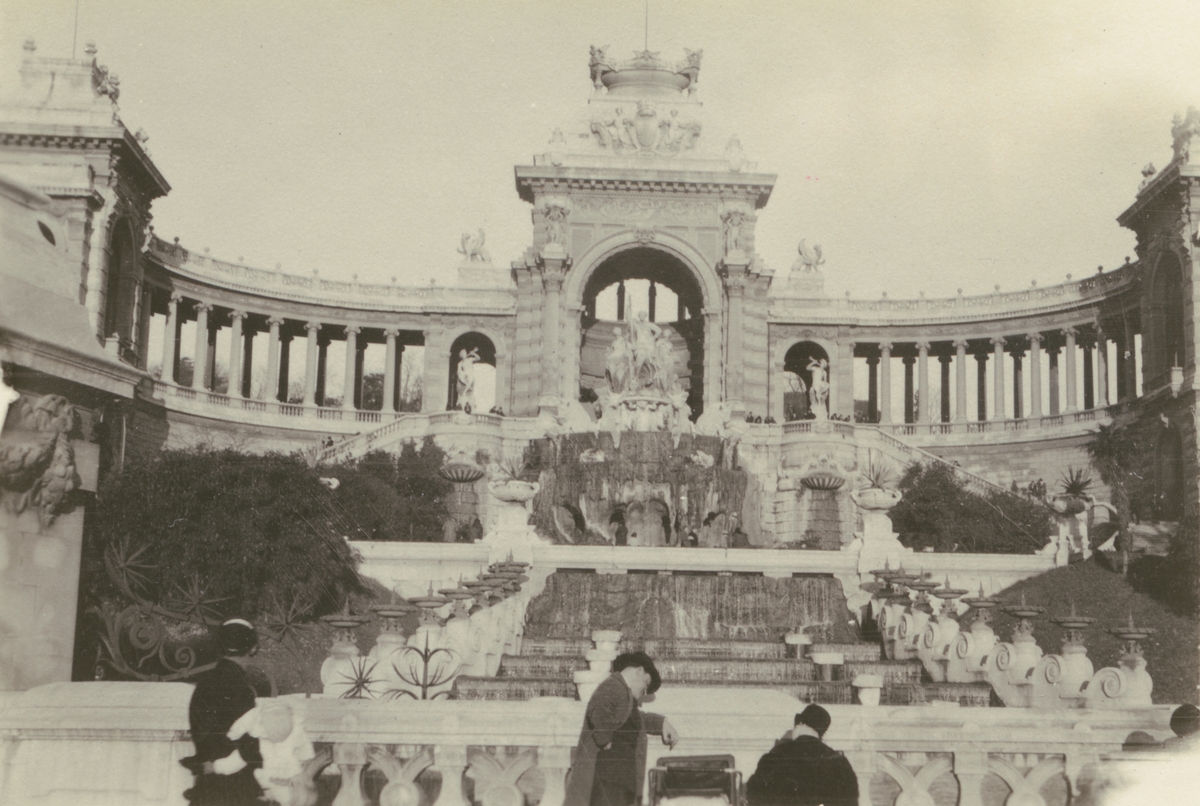 Fotografi från Albin Ahrenbergs resa till Grönland 1929. Motiv av palatsliknande byggnad med flertalet statyer, pelargångar och trappor.