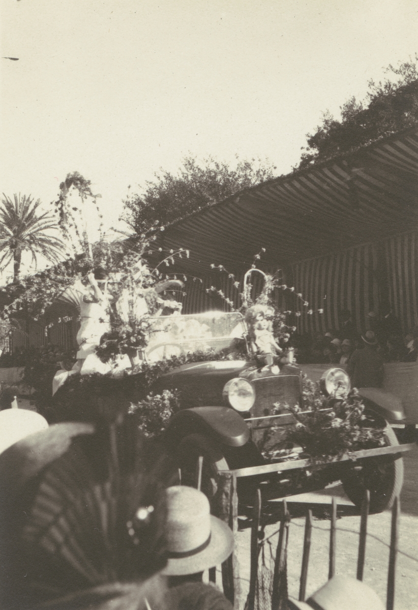 Fotografi från Albin Ahrenbergs resa till Grönland 1929. Motiv av människor som tittar på bil pyntad med blommor.