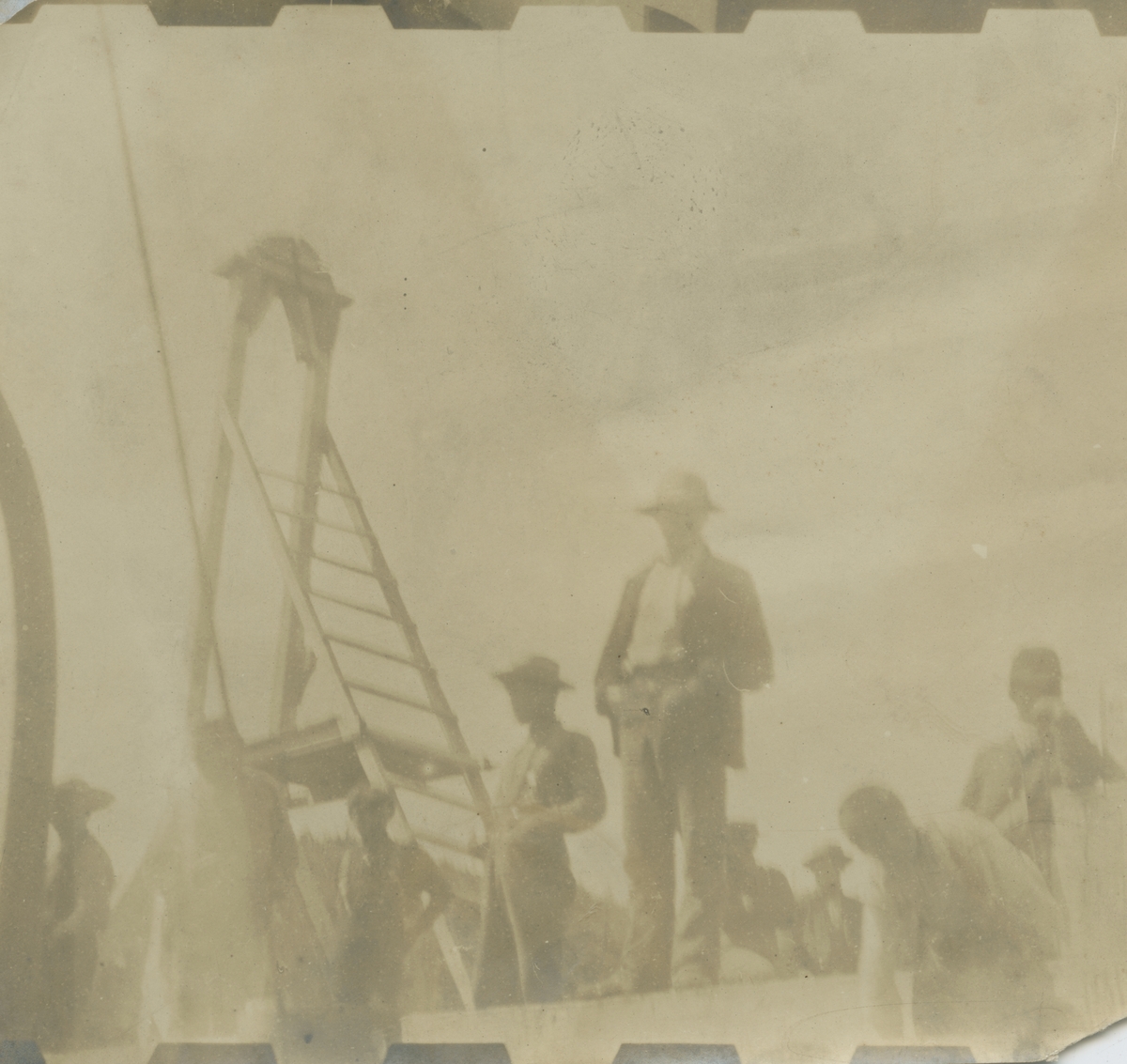 Fotografi från expedition till Grönland. Motiv av en grupp män och en pojke som står vid en kaj.