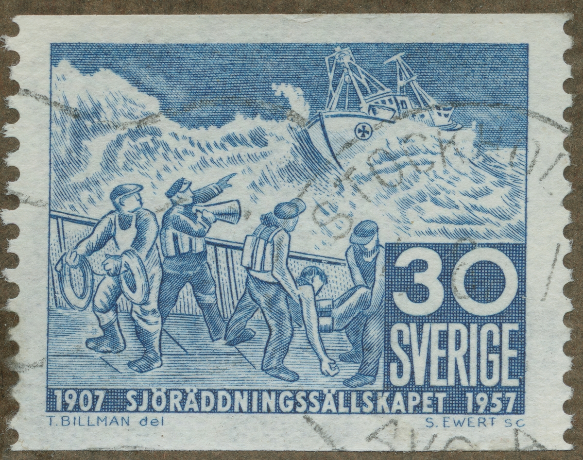 Frimärke från Sverige, 1957. Motiv av Svensk Sjöräddning Svenska Sjöräddningssällskapet 50 år 1907-1957