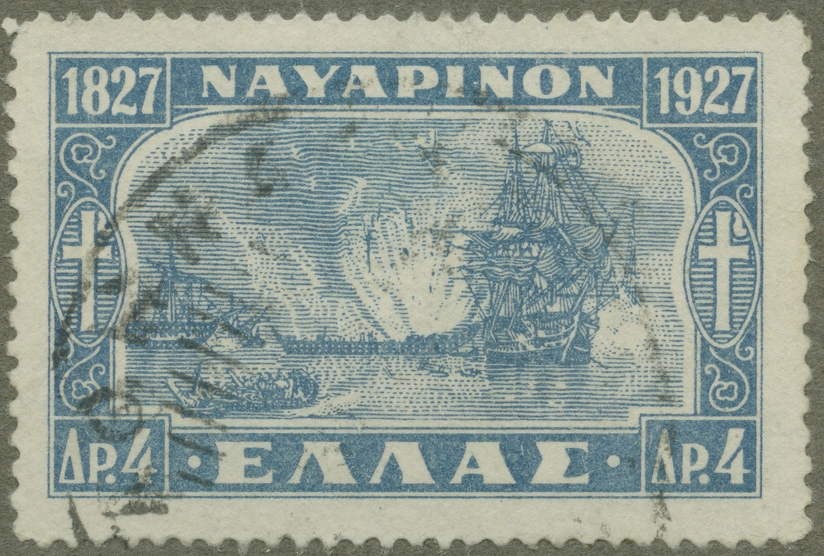Frimärke från Grekland, 1927. Motiv av Slaget vid Navarino: världens sista större segelfartygsstrid: 20 oktober 1827. Avgörande för Greklands frihetskamp mot Turkiet. 100-årsminne: 1827-1927.
