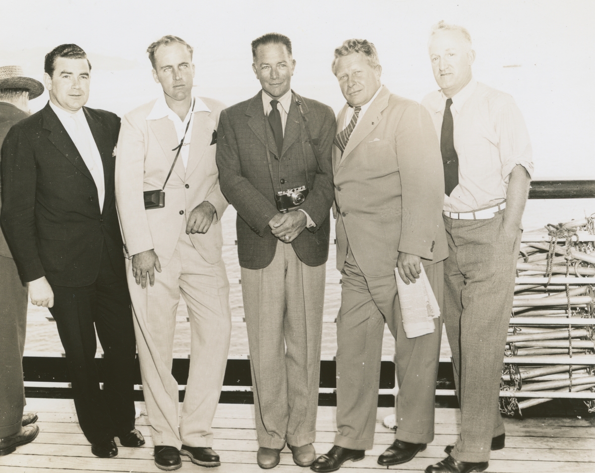 Fotografi från låda märkt Bernt Balchen. Balchen var norsk-amerikansk flygare, polarforskare och militär. Motiv av Balchen, Ellsworth och tre andra män på väg till Nya Zeeland.