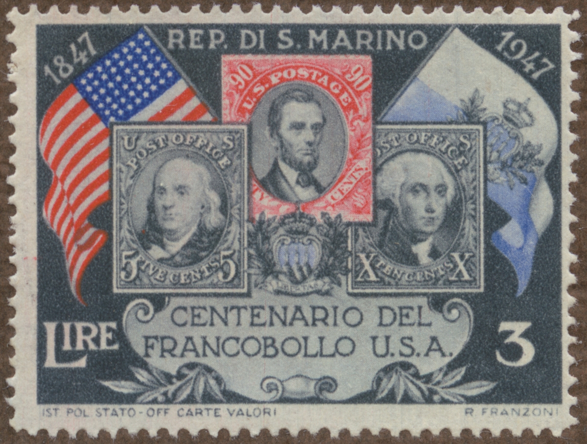 Frimärke från San Marino, 1947. Motiv av Tre gamla U.S.A. märken U.S.A. flagga och San Marino flagga "-USA:s frimärken 100 år 1847-1947."