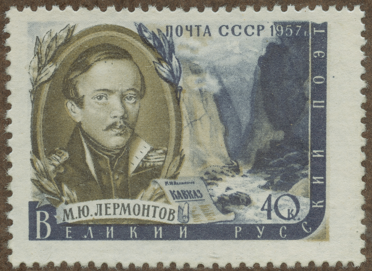 Frimärke från Ryssland, 1947. Motiv av Michail J. Lermontow: 1814-1841. Rysk poet och författare. Byron-påverkad lyrik. Romanen: "Vår tids hjälte", 1840.