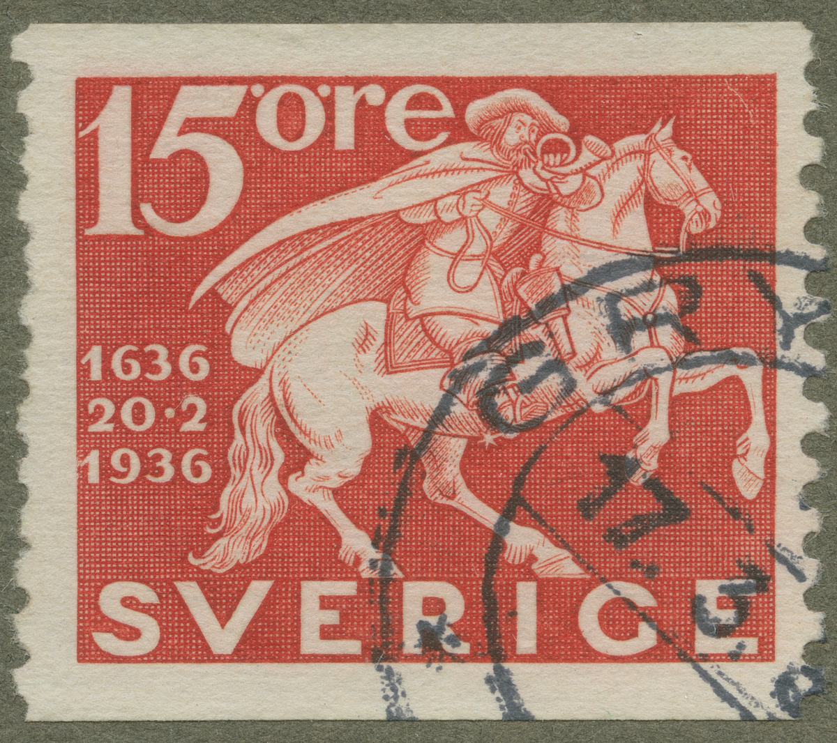 Frimärke från Sverige, 1936. Motiv av Postryttare Första bestämmelsen om uniformer för svenska postiljoner är av år 1689. Under 1600- och 1700-talen användes mest ridande postiljoner. - Till svenska postväsendets 300-årsjubileum. 1636-1936.
