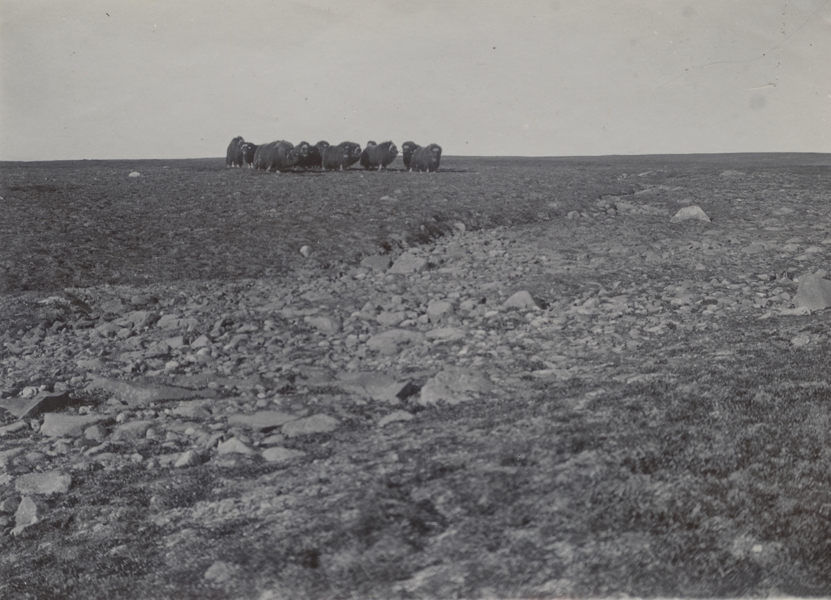 Fotografi från expedition till Grönland. Landskapsbild med myskoxar i bakgrunden.