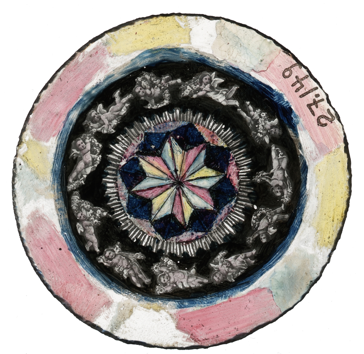 Colorerad bild på glas för Skioptikon/Laterna magica.