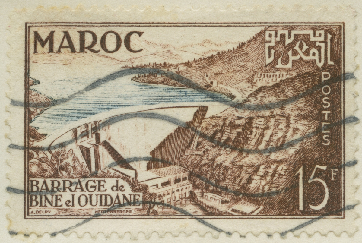Frimärke från Franska Marocko, 1953. Motiv av Hamnen: Bine el Ouidane dammen: invigning 1953
