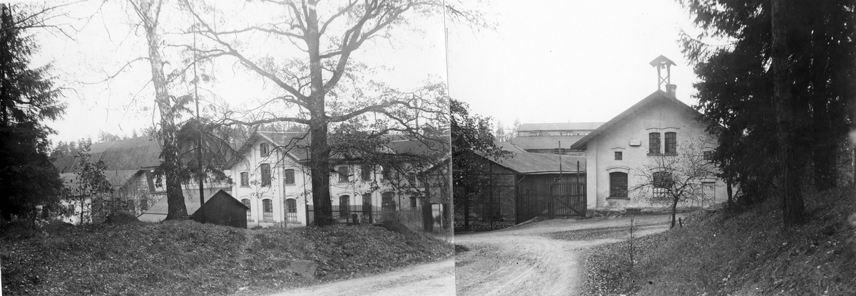 Ingången till verkstaden. Det vita huset t.v. är mekaniska verkstaden, byggd av Uhr år 1868-69# brann ned den 29.4 1926