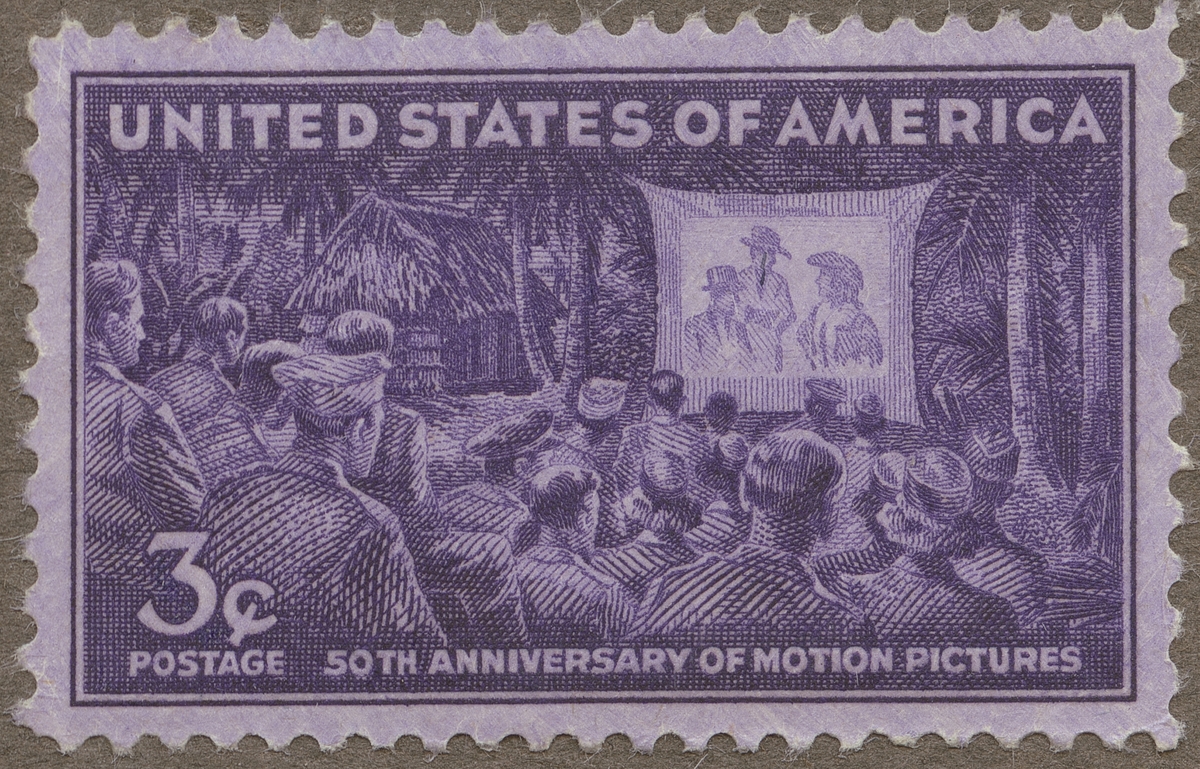 Frimärke ur Gösta Bodmans filatelistiska motivsamling, påbörjad 1950. Frimärke från USA, 1944. Motiv av Fältbiograf i det fria.