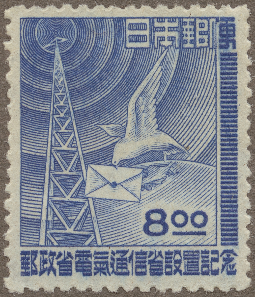 Frimärke ur Gösta Bodmans filatelistiska motivsamling, påbörjad 1950. Frimärke från Japan, 1949. Motiv av Från brevduvan till radiovågor "Japansk symbol. Till minne av grundandet av postväsendet och radiokommunikationerna.