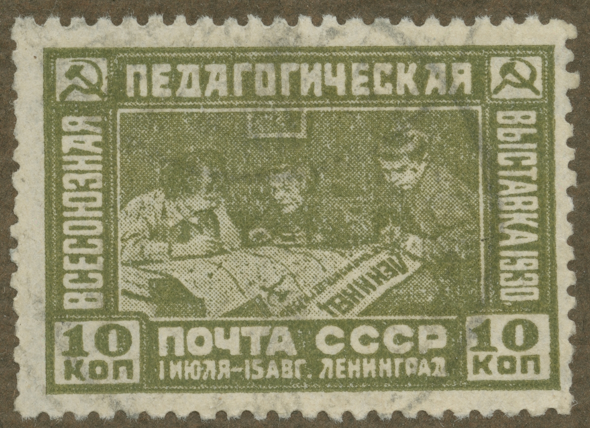 Frimärke från Ryssland, 1930. Motiv av tidningsläsande pojkar. "Första Pedagogiska Utställningen i Leningrad 1.7 - 15.8.1930".