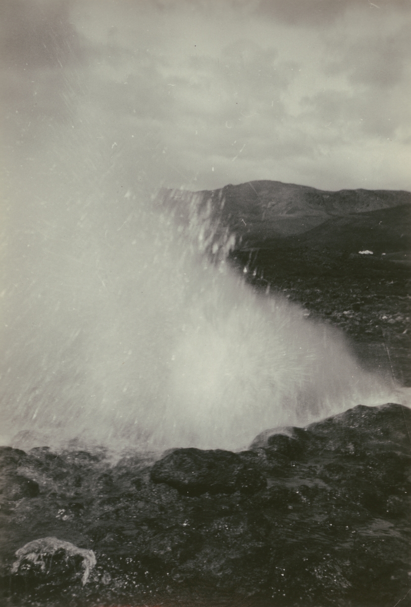 Fotografi från Albin Ahrenbergs resa till Grönland 1929. Motiv av gejser på island som sprutar upp vatten.