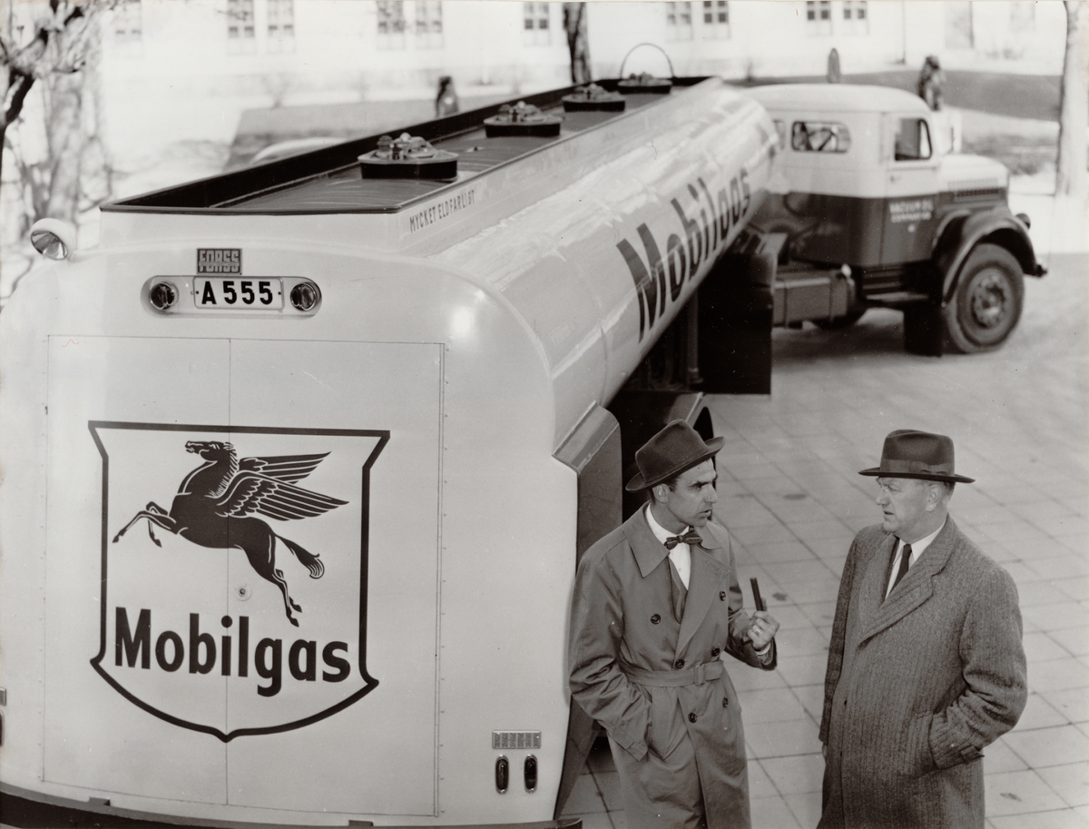 Direktör Einar Bristedt och civilingenjör Erik Törenell vid en av Vaccum Oils tankvagnar som rymmer 16 000 liter.