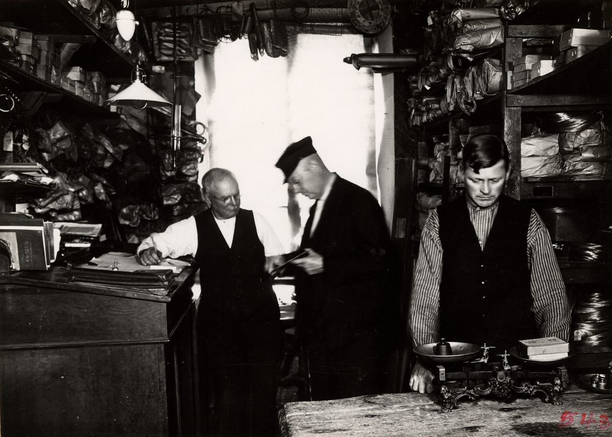 Verkmästarekontor vid J.H. Tidbeck Metallduksväveri och Metalltrådsvarufabrik. Till vänster Verkmästare Nilsson och i mitten Fabrikör G.R. Herman Tidbeck.