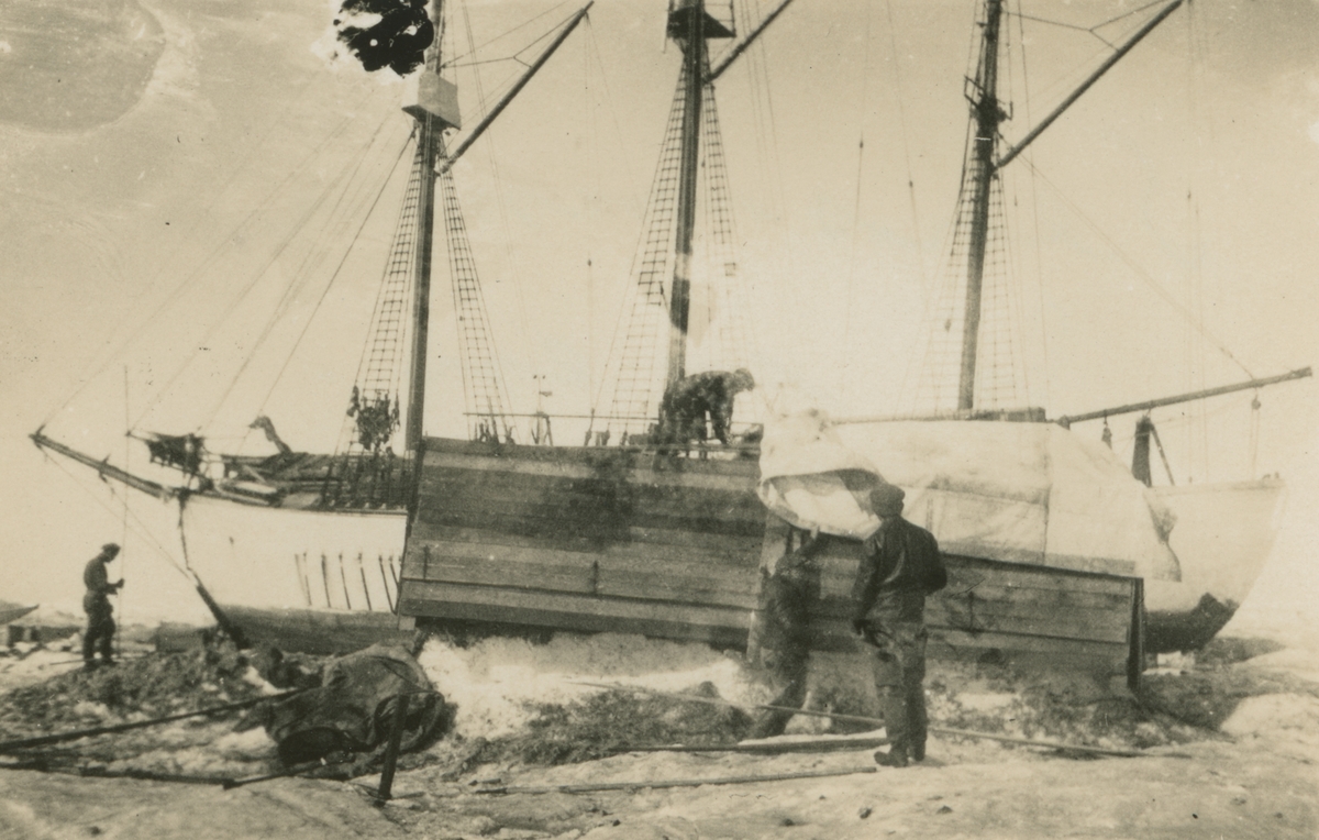 Fotografi från Maudexpeditionen. Motiv av män och båt vid is.