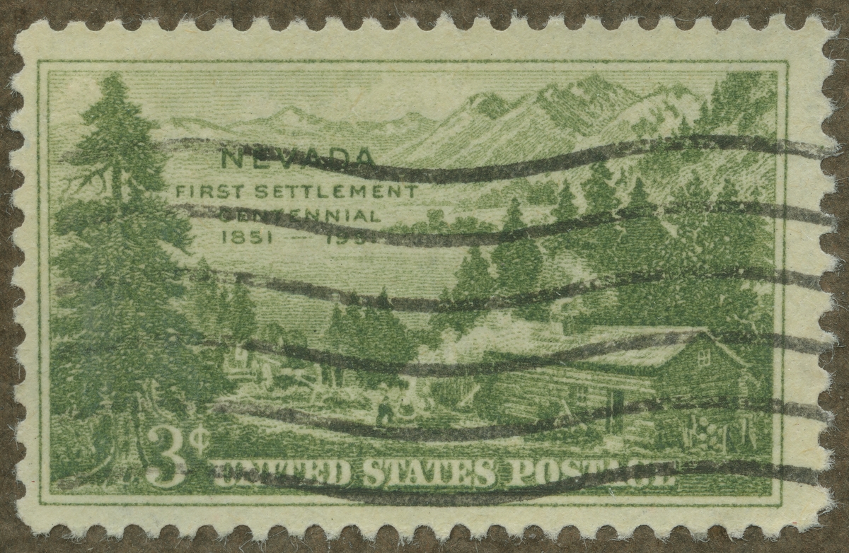Frimärke från USA, 1951. Motiv av första nybyggarstugan i Nevada. "100-årsminne: 1851-1951".