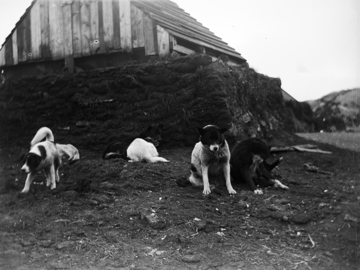 Fotografi från Grönland. Motiv av hundar framför hus.