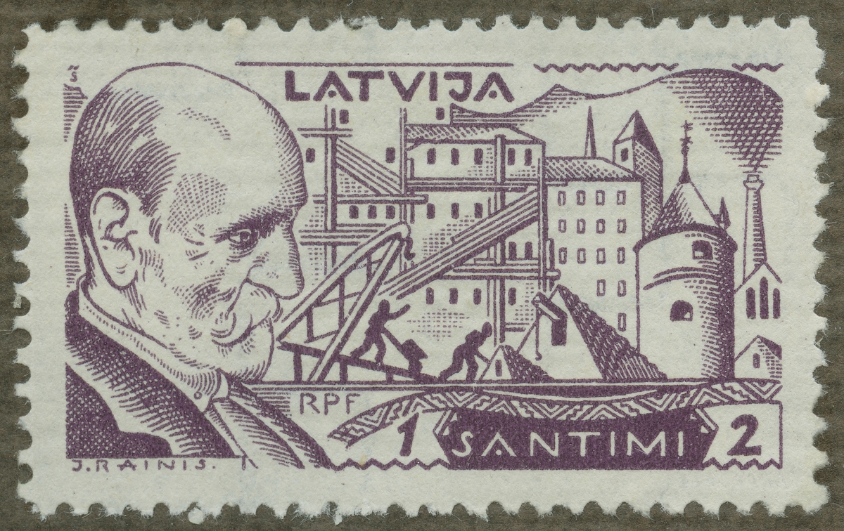 Frimärke från Lettland, 1930. Motiv av byggnadsarbetare för ett monument över författare Rainis.