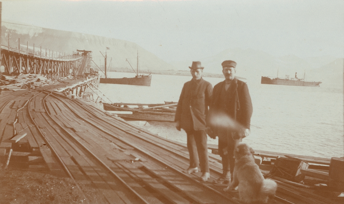 Fotografi från expedition till Spetsbergen. Motiv av två män och en hund som står på en kaj. I bakgrunden syns berg och båtar.