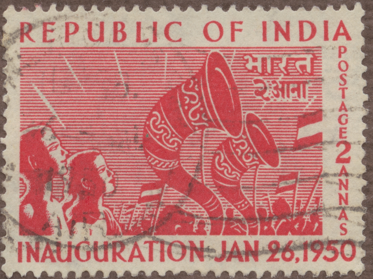 Frimärke från Indien, 1950. Motiv av trumpeter. "Indiska Republiken ett år: 26 januari 1950".