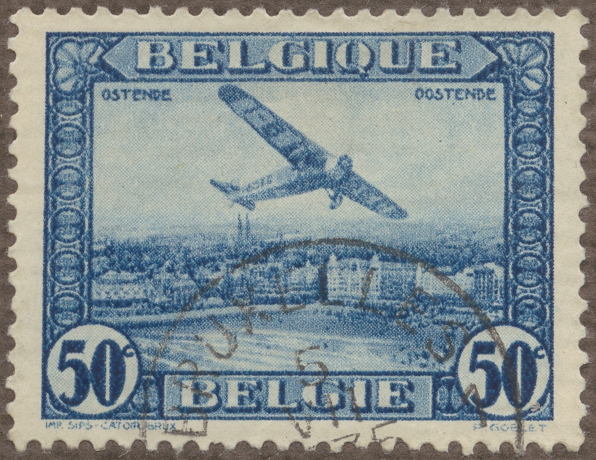 Frimärke från Belgien, 1930. Motiv av Monoplan över staden Ostende