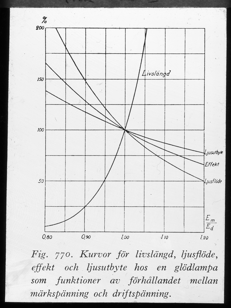 Kurvor för livslängd, ljusflöde, effekt och ljusutbyte hos en glödlampa som funktioner av förhållandet mellan märkspänning och driftspänning.