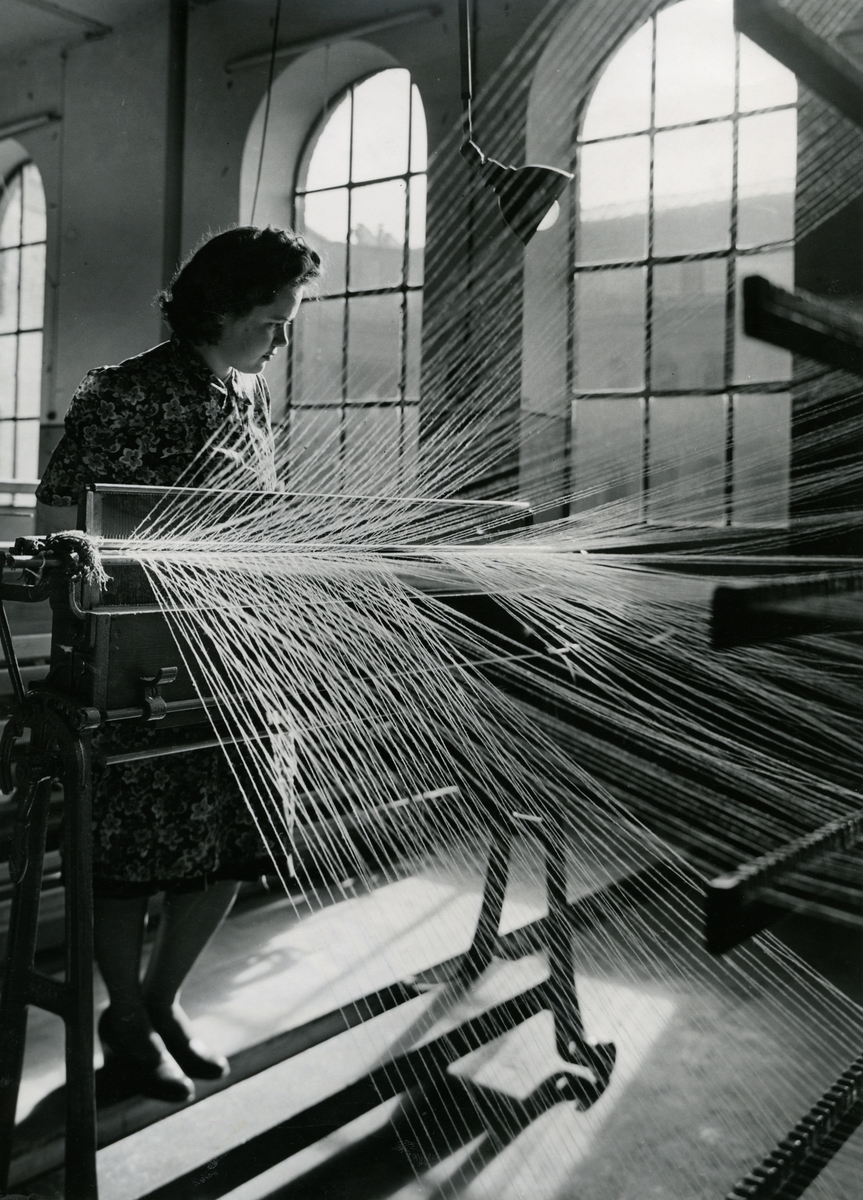 Kättingskäreriet på Malmö Yllefabriks AB. De från garnspolarna kommande trådarna löper samman till skärkronan.