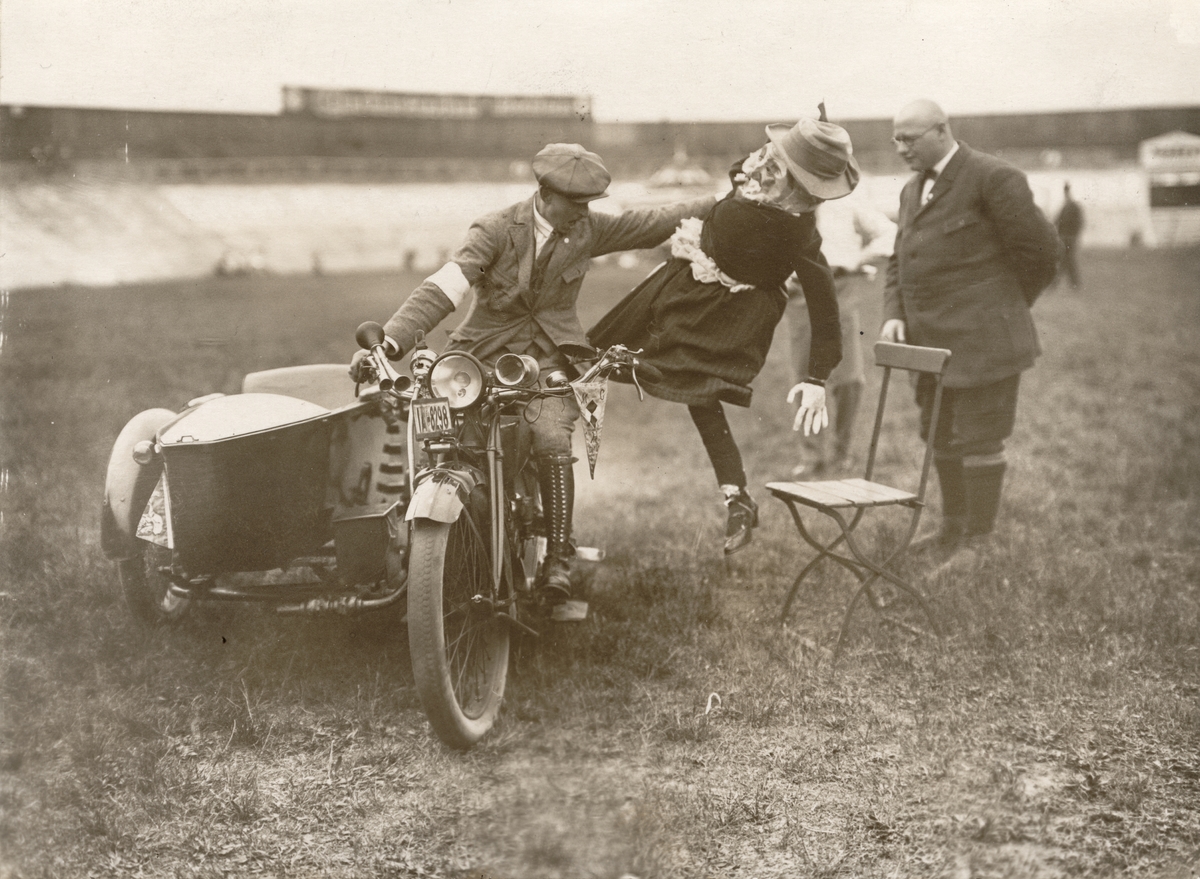Skicklighetstävlan för motorcyklister på Olympiabanan, Berlin. Upptagande av docka under loppet, omkring 1936.