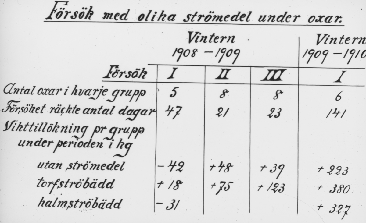 Skioptikonbild. Tabell över försök med olika strömedel med oxar.