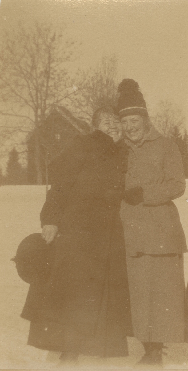 Fotografi från expedition till Spetsbergen. Motiv av två leende kvinnor framför ett hus. Marken är täckt av snö.