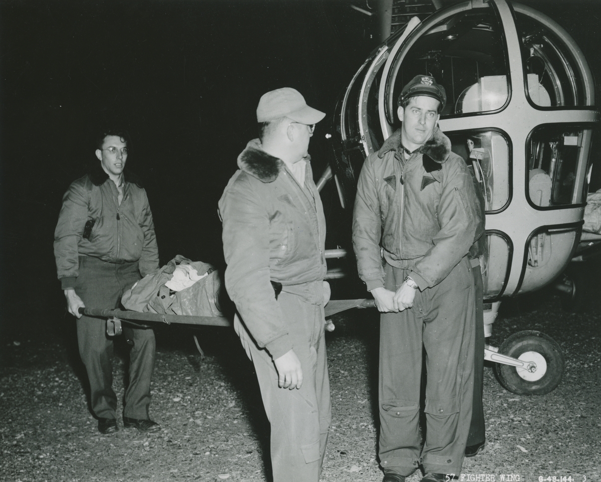 Fotografi från låda märkt Bernt Balchen. Balchen var norsk-amerikansk flygare, polarforskare och militär. Motiv av räddningsarbetare som bär en skadad man på bår vid en Skikorskyhelikopter.