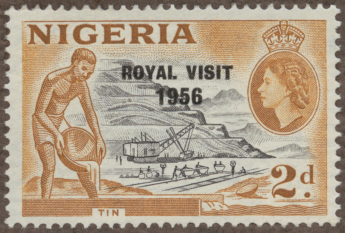 Frimärke från Nigeria, 1953 (kröningsserie). Motiv av Tennmalmsbrytning i Nigeria (t.h.) Drottning Elizabeth II. - Minne av Drottning Elizabeth II:s besök i Nigeria Jan.-Feb. 1956, övertryck "Royal Visit 1956".